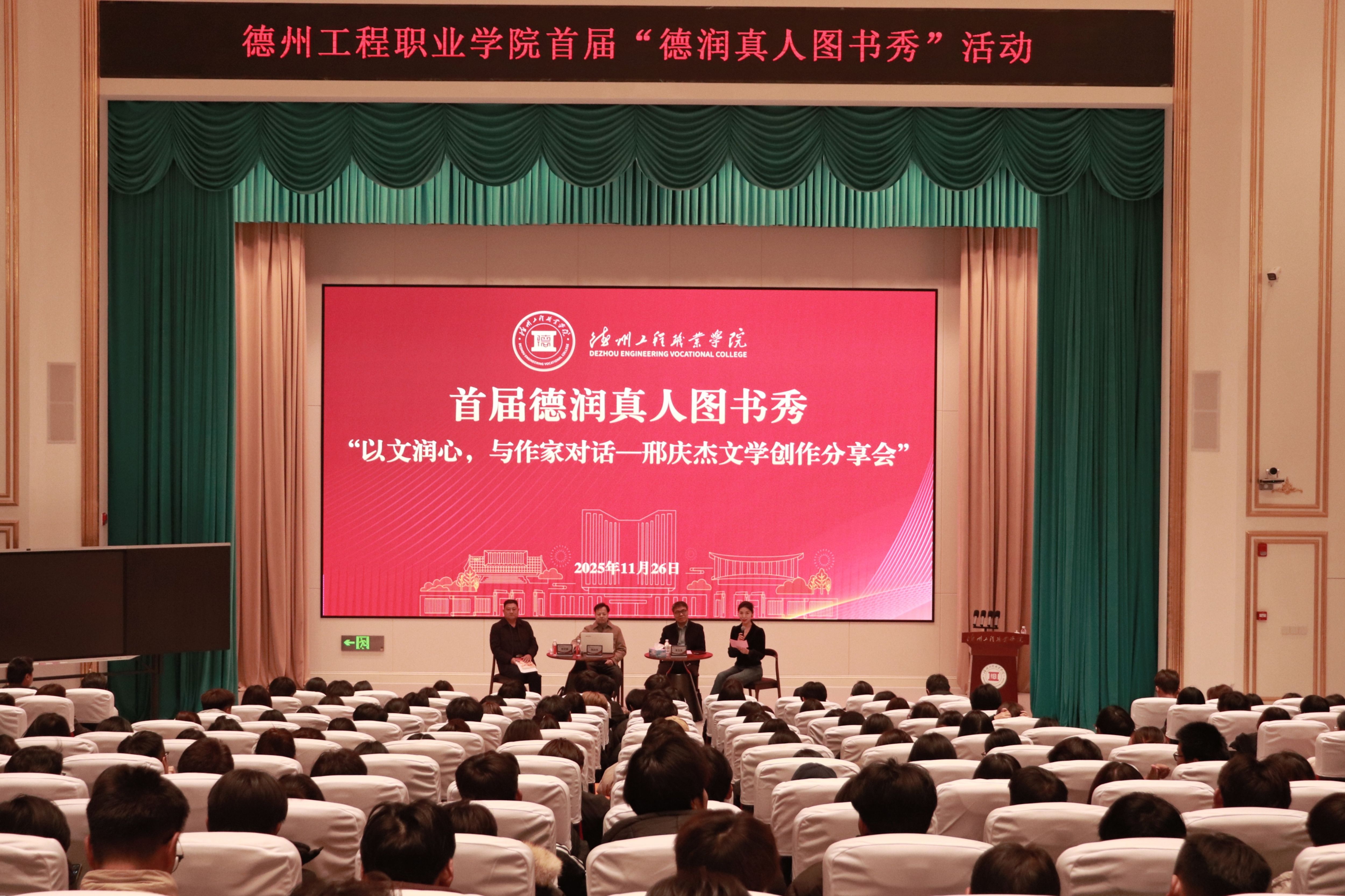 为丰富校园文化生活,提升学子人文素养,11月26日下午16:00,德州工程职业学院倾情打造的德润真人图书秀活动“以文润心,与作家对话——邢庆杰文学创作分享专场”圆满落幕。国家一级作家、德州市作家协会主席、德州工程职业学院客座教授邢庆杰成为首期嘉宾。本次活动由图书馆高鹏主持。德州市作家协会副主席、《德州日报》高级编辑李玉友,德州市作家协会党支部书记李好斌,图书馆全体馆员以及格致读书社、古典文学社、鹿鸣诗社共300余人齐聚一堂,以沉浸式互动的真人秀形式,开启了一场兼具深度与趣味的文学交流之旅。