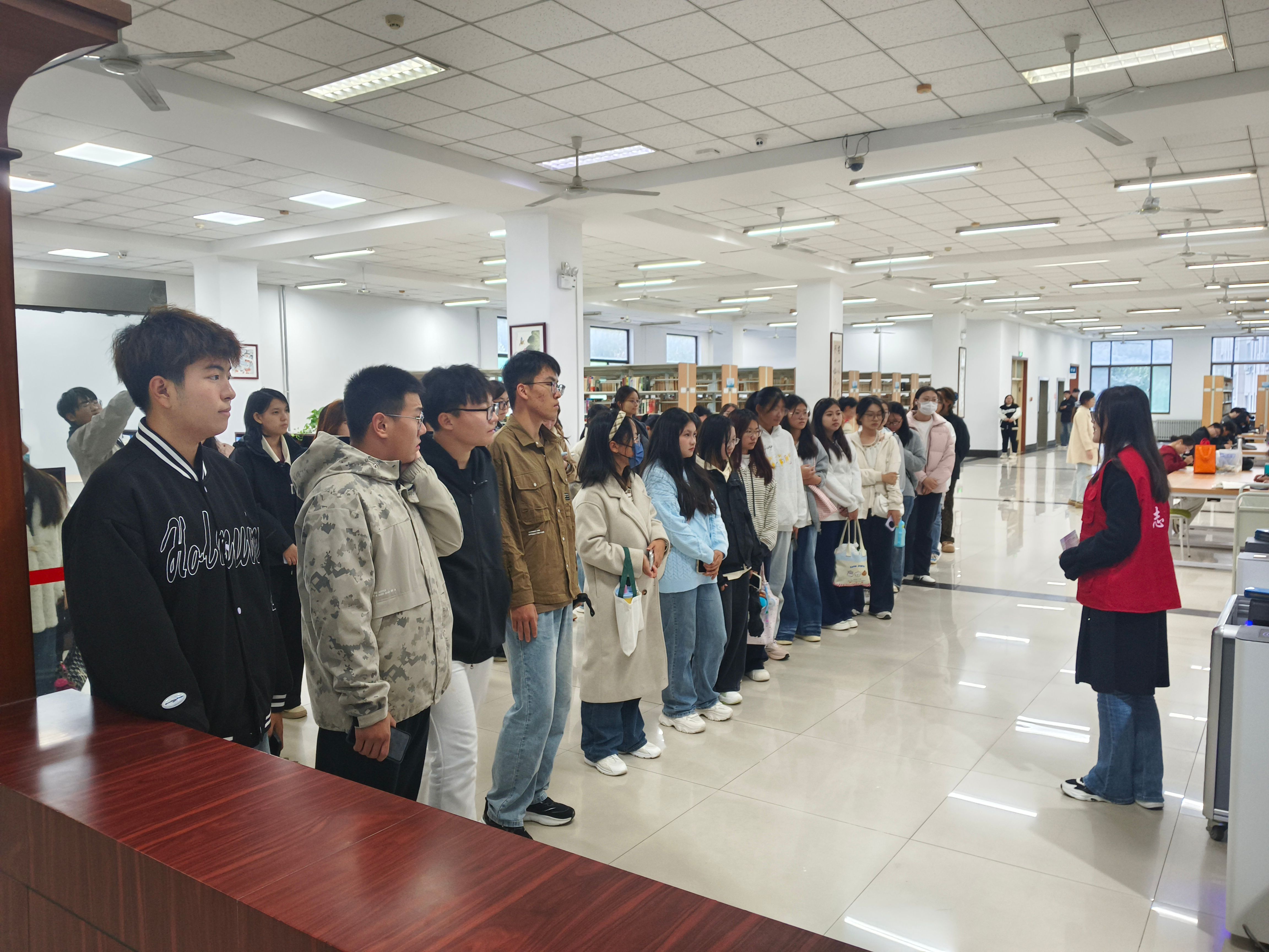 第二阶段是现场参观活动。让新生走进图书馆,体验阅读氛围。为确保参观教育质量,图书馆前期对参与讲解的学生馆员进行了系统培训,内容涵盖馆藏布局、资源特色、服务礼仪及常见问题解答,力求为新生提供专业、清晰的导览服务。参观过程中,讲解员们引导新生依次走进各学科藏阅室,详细介绍了不同区域的功能定位、藏书特点及开放时间。在社会科学、自然科学、文学艺术等专题阅览区,丰富的藏书和静谧的学习环境给新生们留下了深刻印象。借阅服务是新生关注的重点。讲解员演示了自助借还书设备的操作步骤,清晰讲解了图书查询、借阅规则、续借方式及逾期处理等注意事项,并特别提醒新生爱护图书、按期归还。本次入馆培训从讲解员培训到组织完成共历时一个多月,组织培训场次共计200余场。