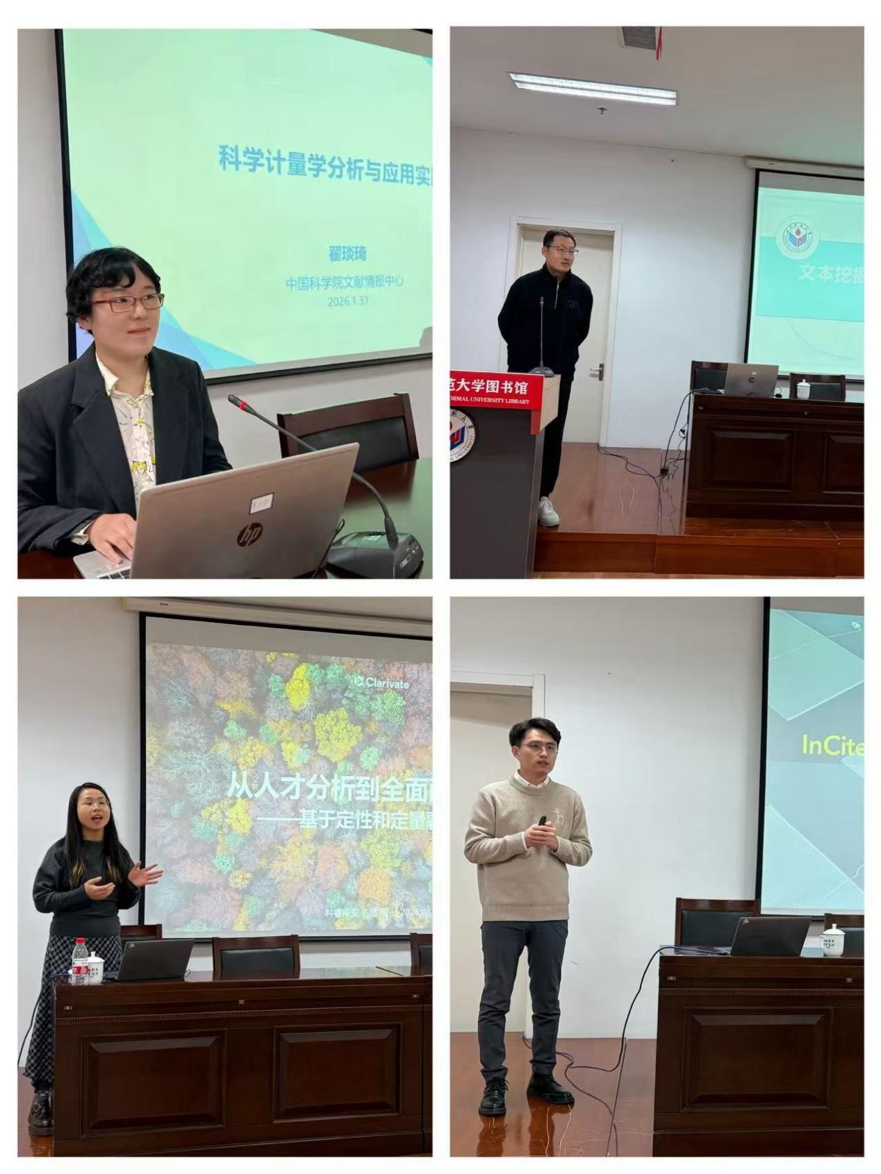 专题培训环节,中国科学院文献情报中心翟琰琦、山东师范大学图书馆宋凯、科睿唯安王振、危期等嘉宾分别围绕科学计量学分析方法、文本挖掘技术赋能情报服务实践、人才全面画像构建路径、InCites赋能学科分析与规划等主题,结合自身研究成果与实践经验,为参会人员带来了兼具理论深度、实践指导性与实操价值的精彩分享,有效拓宽了参会人员的专业视野,夯实了情报服务专业能力。